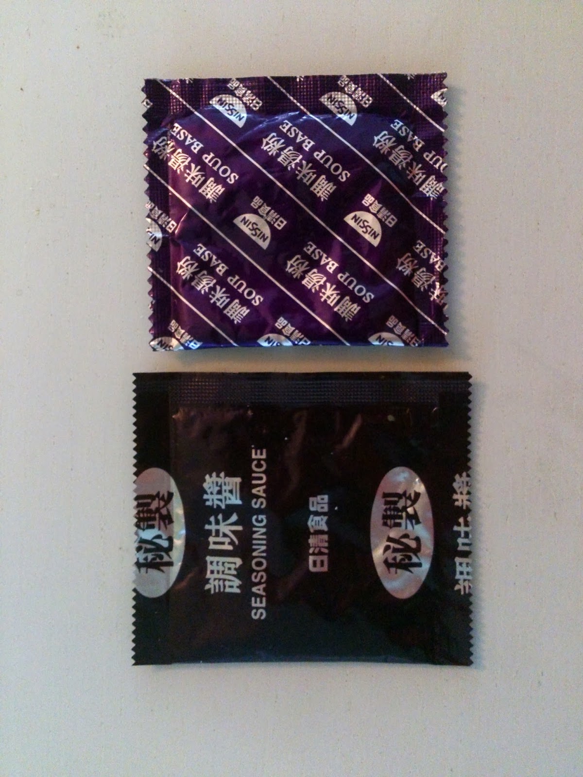 First thing: tonkotsu is a broth simmered from pork bones and shoyu is soy sauce. Inside there is the standard Nissin instant ramen, a soup packet and a sauce packet.